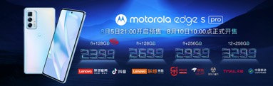 价格方面,摩托罗拉edge s pro 6+128GB版别2499元,首发特惠价2399元;8+128GB版别价格2699元;8+256GB版别手机2999元;12+256GB版别3299元。8月5日21时在各途径敞开预售,8月10日10时正式开售。