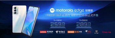 作为我国电信与联想集团首款深度协作云手机产品,摩托罗拉edge轻奢版8+128GB版别价格2599元,8+256GB版别2899元。8月5日21时在各途径敞开预定,8月17日10时正式开售。