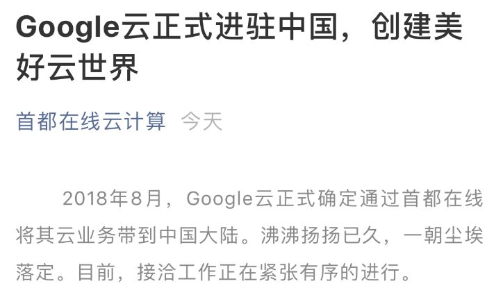 Google 的云事务好像现已进入我国。首都在线云核算今日早些时候经过微信大众号宣告,2018 年 8 月,Google 云正式承认经过首都在线将其云事务带到我国大陆。不过这篇文章现已被删去,大众号“