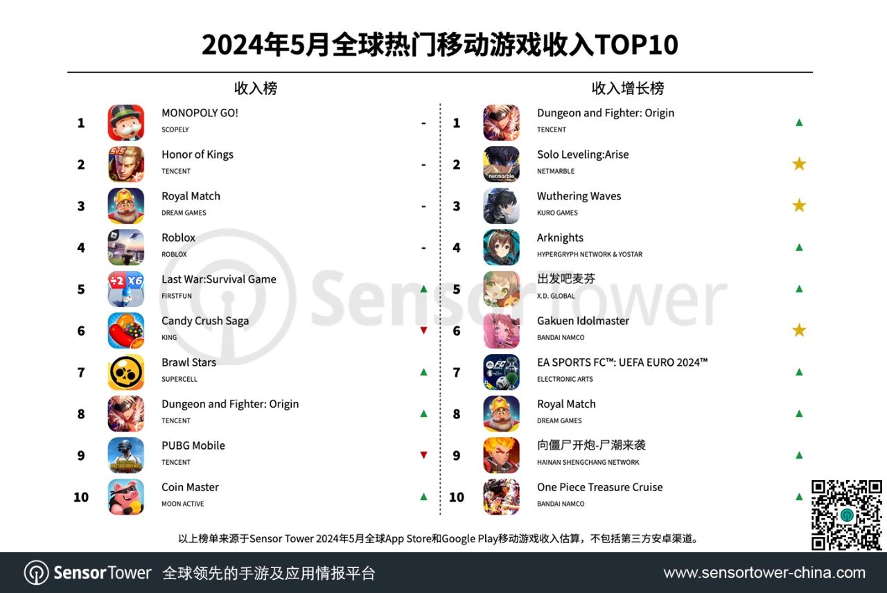 五月,很多新游戏在收入增加榜上独占鳌头。由腾讯发行的《地下城与勇士:来源》在我国商场体现反常超卓,仅用了10天就打破1亿美元的收入纪录,登顶收入增加榜,并在收入榜上位列第8名。