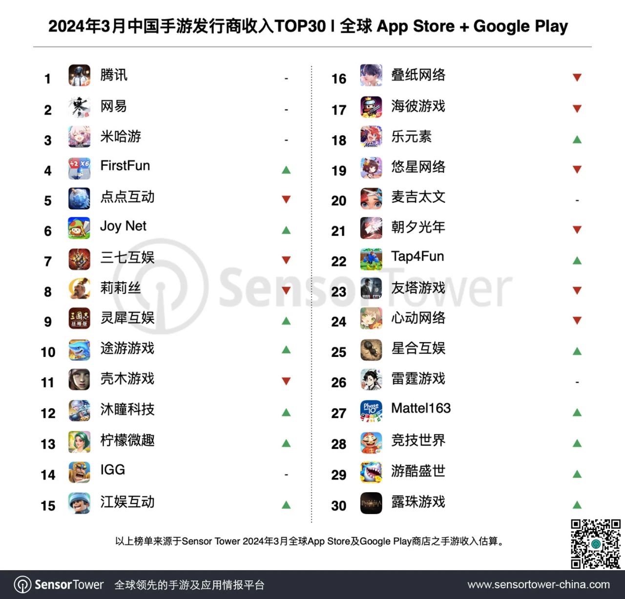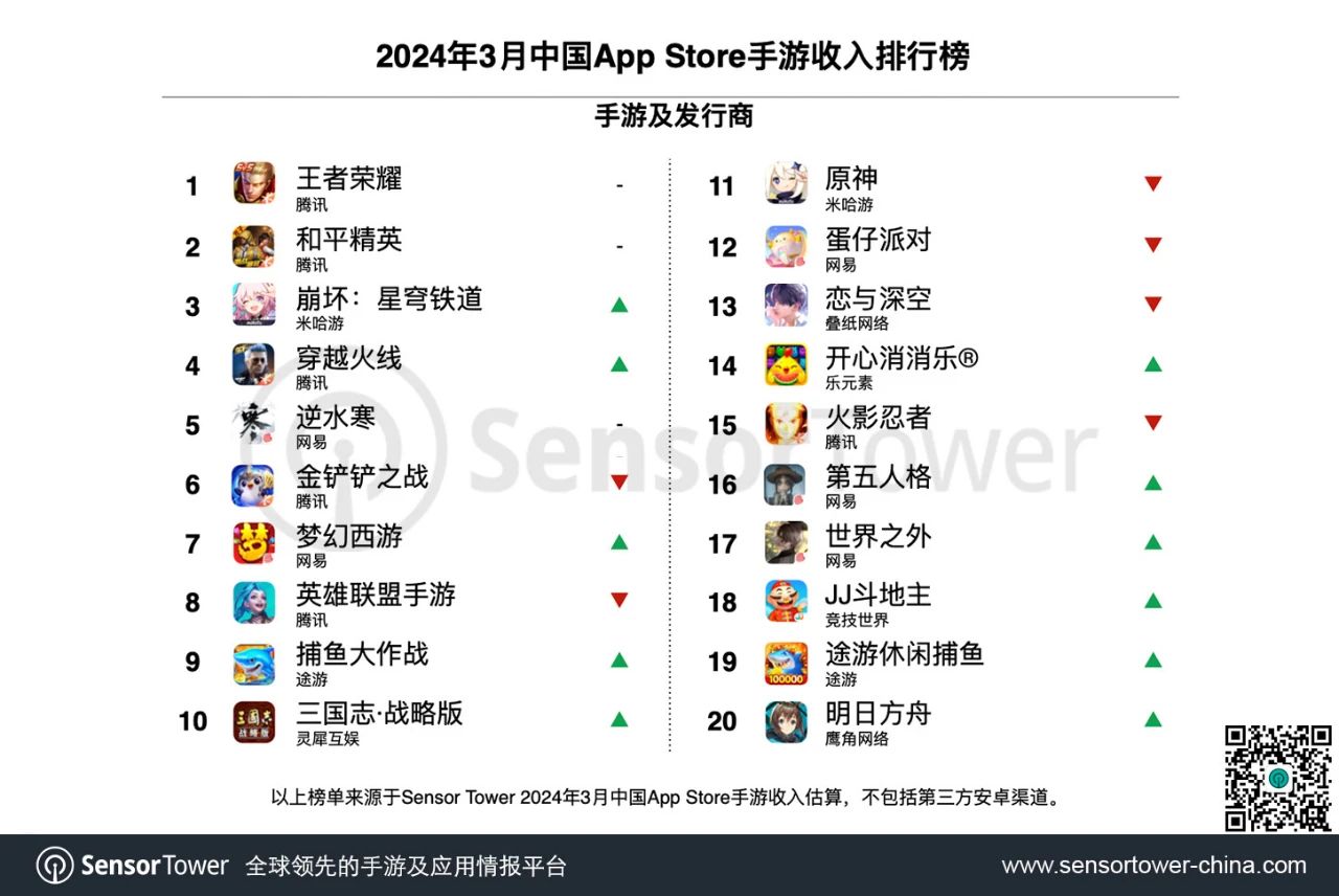Sensor Tower 3 月中国手游发行商全球收入榜:腾讯网易米哈游前三