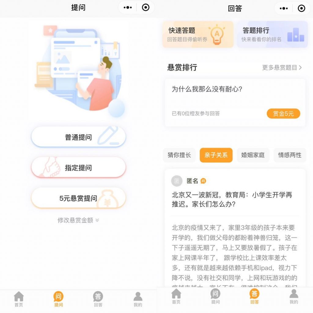 而“橙心答”则类似于心思咨询类的“分答”,用户能够在小程序中挑选发问或答复。发问包含:一般发问、赏格发问和指定发问。朋橙心思邀请了全国100多名心思咨询师,依据不同的等级有不同的发问价格。而赏格发问则会招引更多的人来活跃答复,最后由发问者挑选最满足的答案,一起用户也能够花钱围观问题的答案。“与分答或市面上付费发问不同的是,橙心答的答复问题的人都是专业的心思咨询师,他们往往会从心思学的视点来剖析问题,也会给出更有利的主张。”全云峰说道,现在橙心答上首要环绕的论题有:亲子关系、婚姻家庭、情感两性和个人开展等。“一般私密性比较强,处理个人的问题,橙心答为一些想要得到专业解读和主张的人供给了一个渠道。”